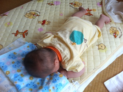 足ばっかりバタバタさせるので、今にもハイハイしそうです(笑)
